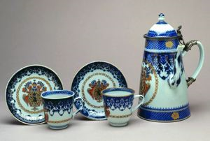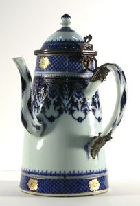 During the 18th century it was common for individuals or families to commission services of porcelain personalized with family coats of arms, crests and mottoes. Stock forms were generally decorated to order in Canton. This coffee pot has the arms of Panier of Franche-Comté. A variety of forms with these arms are known to exist and therefore it seems an entire dinner service was most likely commissioned. The silver mounts on the coffee pot were added in the nineteenth century.