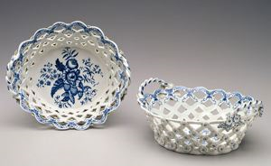 These baskets are decorated with a transfer-printed design of a peony between two pine cones and a pomegranate. The "Pine Cone" pattern, as it is sometimes called, was used on a wide range of Worcester shapes during the 1770s, including plates, dishes, turreens, junket dishes and round and oval baskets.