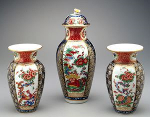In the course of its early years, Worcester made a variety of vases which ranged from simple bottle shapes to more elaborate molded forms inspired by silver prototypes. This trio is decorated in the Japanese Kakiemon style where imaginary Ho-Ho birds are placed among fanciful chrysanthemums, bamboo, and other exotic vegetation in landscape settings. Kakiemon porcelain favored famille verte colors and ususally depicted a central motif of flowers, animals or birds perched on or beside trees. They also featured narrow diaper (or diamond-shaped borders).