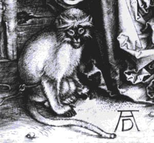 This engraving has always held a special appeal, both because of the delicate charm of Mary’s demeanor, and because of the exotic character of the monkey chained at her feet. In works of art of this period, monkeys signified attributes of human behavior such as lust or greed, and were also seen as representing evil or the devil. It has been suggested that here the monkey is shown as a contrast to the Virgin, signifying the victory of spiritual purity over mankind’s baser instincts. The chained monkey may also be an allusion to Eve, again in contrast to the Virgin and her role in vanquishing original sin. The serene and somber expression of the monkey contrasts markedly with the agitation of the bird, which flaps its wings in distress as the Infant firmly grasps its legs. The bird is commonly interpreted as an allusion to the human soul, in this situation probably captive and subject to the will of God. See "Faith and Humanism: Engravings and Woodcuts by Albrecht Durer," exh. cat. (Montgomery: Montgomery Museum of Fine Arts, 2002), 56.