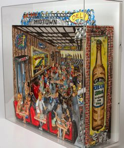 Bud Shark of Shark, Ink., was the master printer for Deli. Grooms and Shark have had a productive relationship since they began making prints together in 1981. The collaboration of an artist and master printer is critical in complicated three-dimensional projects such as Deli. Grooms notes, “the chemistry between an artist and a printer will determine what types of projects they will undertake together.” (1) Grooms pays tribute to their collaboration with the advertisement on the wall for “Bud Beer,” and in the name of the establishment, “Red and Bud’s Midtown Deli.”
