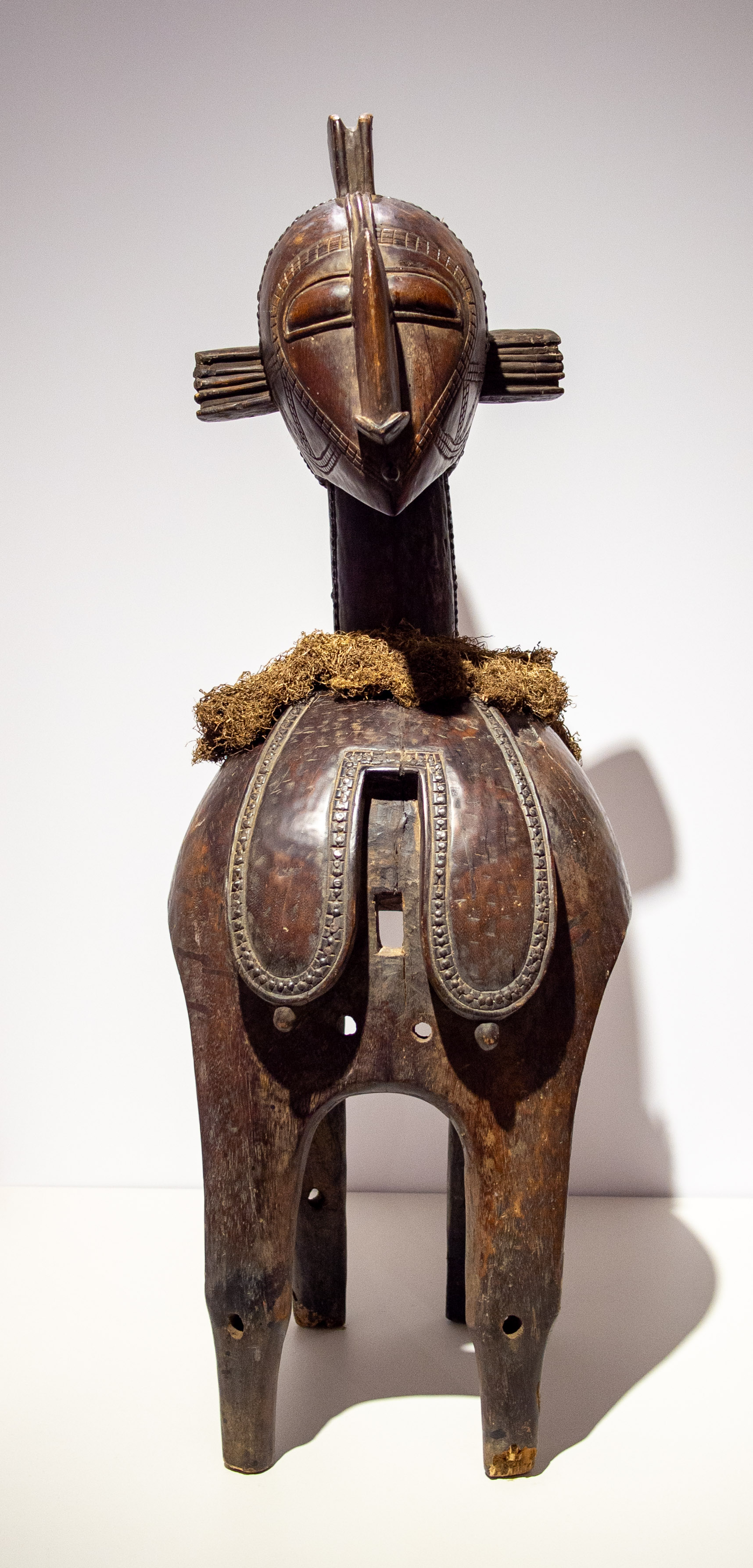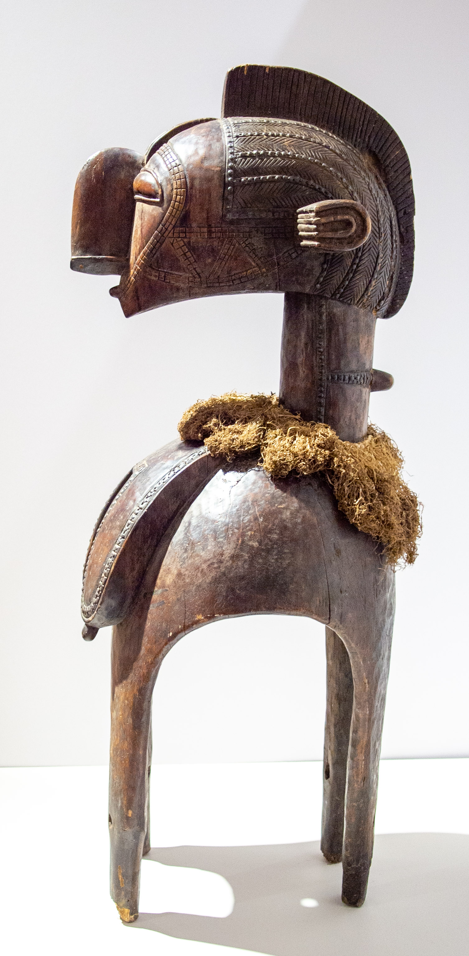 Masks were traditionally made and worn in performance by men, accounting for the large size and weight of this D’mba mask made by the Baga people of Guinea. D’mba is the “universal mother,” and represents a mature, resilient woman who has borne children. It rests upon the shoulders of a dancer wearing a raffia costume, and would thus be highly visible to those viewing the mask performance. Its scale would have required a man of significant strength to bear its weight while moving as required in the dance. D’mba appears at planting and harvesting festivals, marriages, births, and funerals, and is connected to the prosperity and well being of the community as a whole.