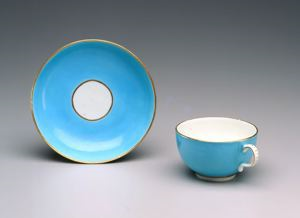 Worcester's bleu celeste ground was based on a Sèvres ground color which, in turn, was inspired by Chinese Kangxi porcelain. The turquoise ground also may have derived from Chelsea, where it was introduced around 1760. The color was introduced at Worcester in the late 1760s and was most often used as an unadorned solid ground with gilt borders. It occurs chiefly on teawares and dessert services of the 1770s and occasionally on vases, mugs and masked jugs.