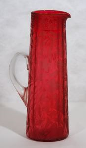 Colored pitchers and glassware were popular for these events because of their feminine delicacy. The floral designs of ivy and columbine on the pitcher were inspired by the Aesthetic Movement of the late 1800s, an art movement originating in Europe that was influenced by simple nature scenes and designs originally found in Japanese art.