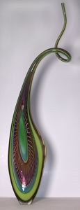 "Dinosaur" is one of a series that Taglipietra developed around 2001, and a shape that he continued to produce over time. The shape is perhaps the most attenuated and spontaneously free-formed of all of his blown shapes; the inspiration for which comes from the lagoons of Tagliapietra’s Venetian home. The museum’s sculptural vessel has many of the characteristics that have come to identify Tagliapietra’s masterworks, including selective interventions of caned glass filament and precise cold-worked textures designed to enhance the form. The neck and mouth of the piece also have what appears to be a more intricate, biomorphic silhouette; found more commonly in his 2005/2006 work with this shape. Tagliapietra’s work is unique in the realm of studio glass because of his ability to fuse traditional Venetian hand-blown and cold-worked techniques with a modern aesthetic that takes into account ever-stretching boundaries of glass as both functional and sculptural.