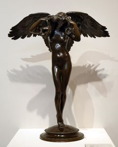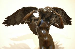 In this composition, the languid female figure appears to float softly to earth, buoyed by her enveloping wings, touching the ground lightly with her toes. The heavy eyelids of her sleepy face, the long hair lifted by her graceful hands, and the sinuous curves of her svelte nude body are combined in an extraordinary expression of ideal feminine beauty.