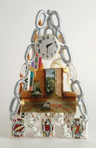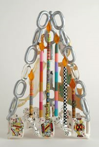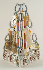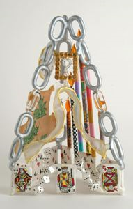 "The Art Game" displays the whimsy of artist Ginny Ruffner. A pyramid of chains rises from a playing-card-and-die base and holds what Ruffner terms “issues surrounding making a living from art.” Paintbrushes—tools of the trade—stand like soldiers at one side. Another side features a painting of a domestic interior opening toward a garden, representing the “necessity of contemplative space,” above which is a clock reading 2:30, which signifies Ruffner’s lucky number: 23. The third side holds a question mark enclosed in a gilded frame, representing the creativity that allows an artist endless possibilities. All of these are attached to the pyramid of chains, which do not bind but instead provide support. The entire sculpture is the product of lampworking, an intricate process in which the artist heats rods of glass over a gas-oxygen burner and shapes them with small tools. On many of the clear rods, Ruffner then adds details with paint.