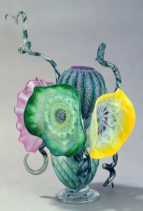 "Melon Bouquet" was created by the Birmingham-based artist Cam Langley in 1999. It is stunning in its brilliantly glossed greens, pinks, and yellow floral forms. These blown-glass forms flow effortlessly into the air in swirling bursts of line and color. Langley did not make any preliminary drawings for his assemblage pieces such as "Melon Bouquet." He was inspired by the natural forms of fruit and flowers, and by experimentation with combinations of elements.