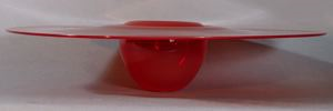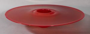 This red glass bowl captures the viewer’s attention with its striking color, orbital ring design, and the suggestion of suspended fluidity. This is an excellent example of one of Moore’s two signature designs—interior and exterior folds. Moore used the appropriately named interior fold process to form this piece. He mimics the historical Italian practice of blowing molten glass and then folding it onto itself. This makes a breaking point around the rim resembling orbital rings along the flat, planar surface. He then carefulley attaches the ring to a round glass ball (‘palla’ in Italian); the molten qualties of both pieces as they are being connected forms a seal around the top of the glass ball creating the whole, finished form. The artist has to make a large number of ‘palla’ and folds in order to successfully create just one of these pieces. He accomplishes his main goal in this piece, “to achieve simplicity, balance, and clarity of form.” Moore further says, “the true challenge of creating an object is give the piece a timeless presence or quality.”